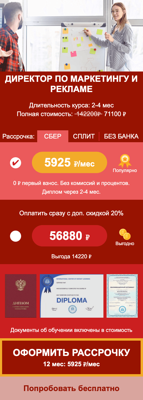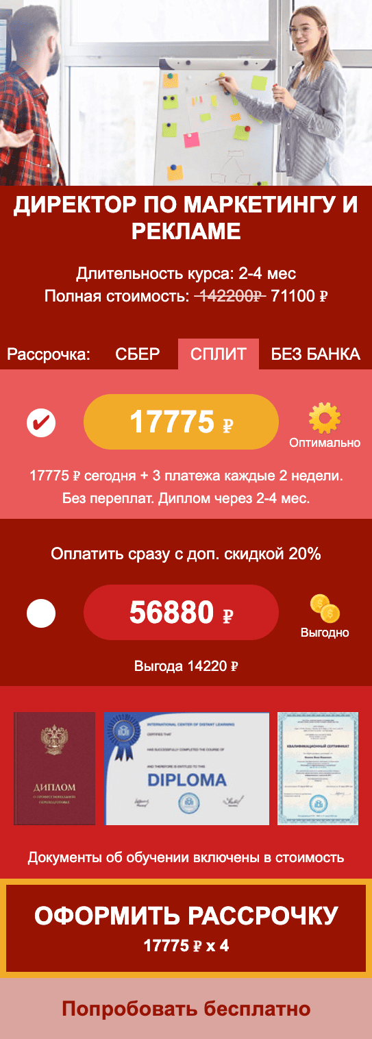 Хотите разделить платеж? Оплатите половину стоимости сейчас, начните обучение, а остаток — перед получением диплома. Никаких переплат!
